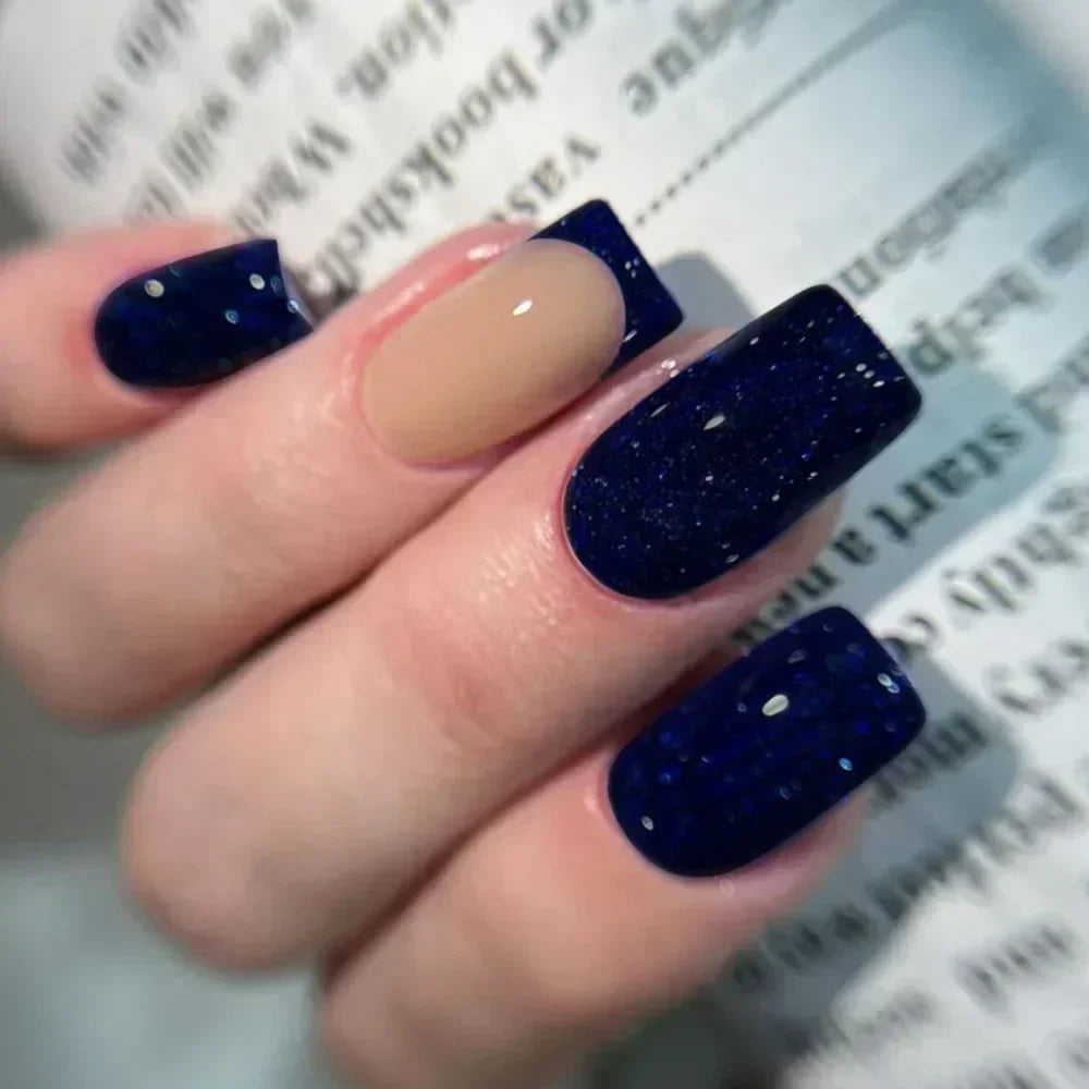 24Pcs Short Square Coffin False Nails Square Fake Nails with Glue French Glitter Wearable Acrylic Nails Set Press on Nail Tips