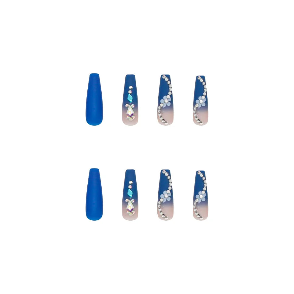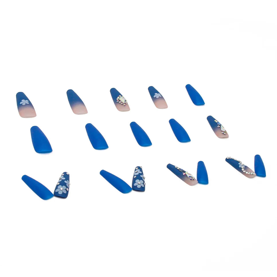 24Ps Super Long Ballet Wearable Fake Nails Blue Diamond Small Flower Press on Nail Stickers Finished Removable False Nail Pieces