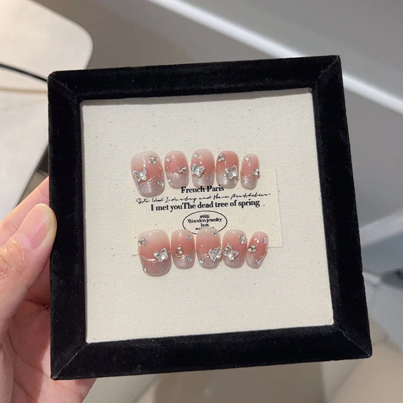10Pc Handmade French Press on Nails Short Blush bow Diamond