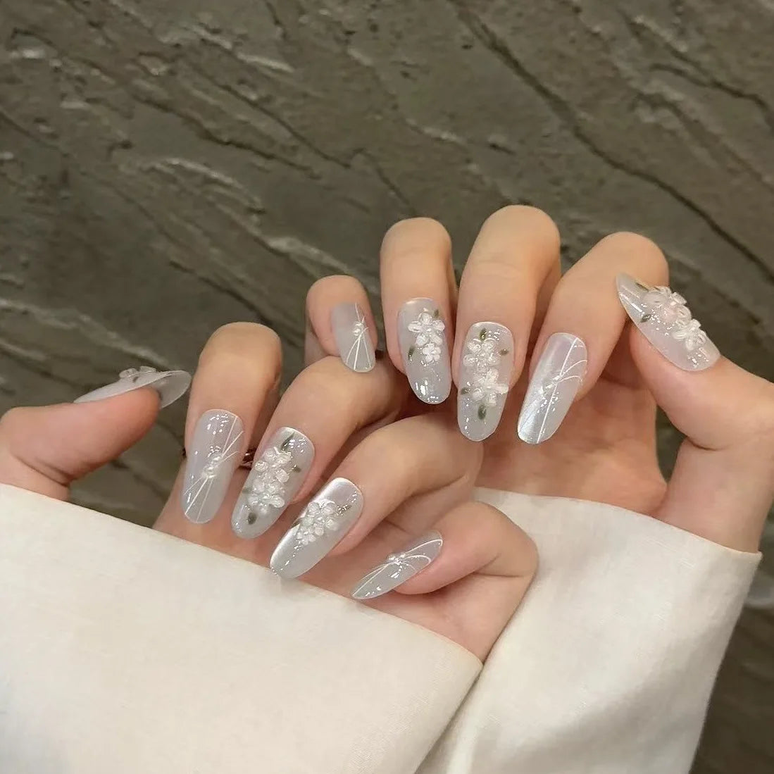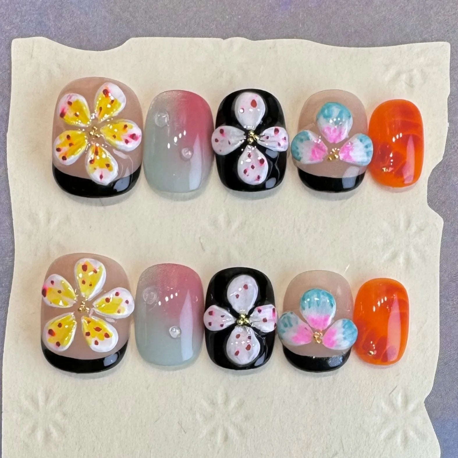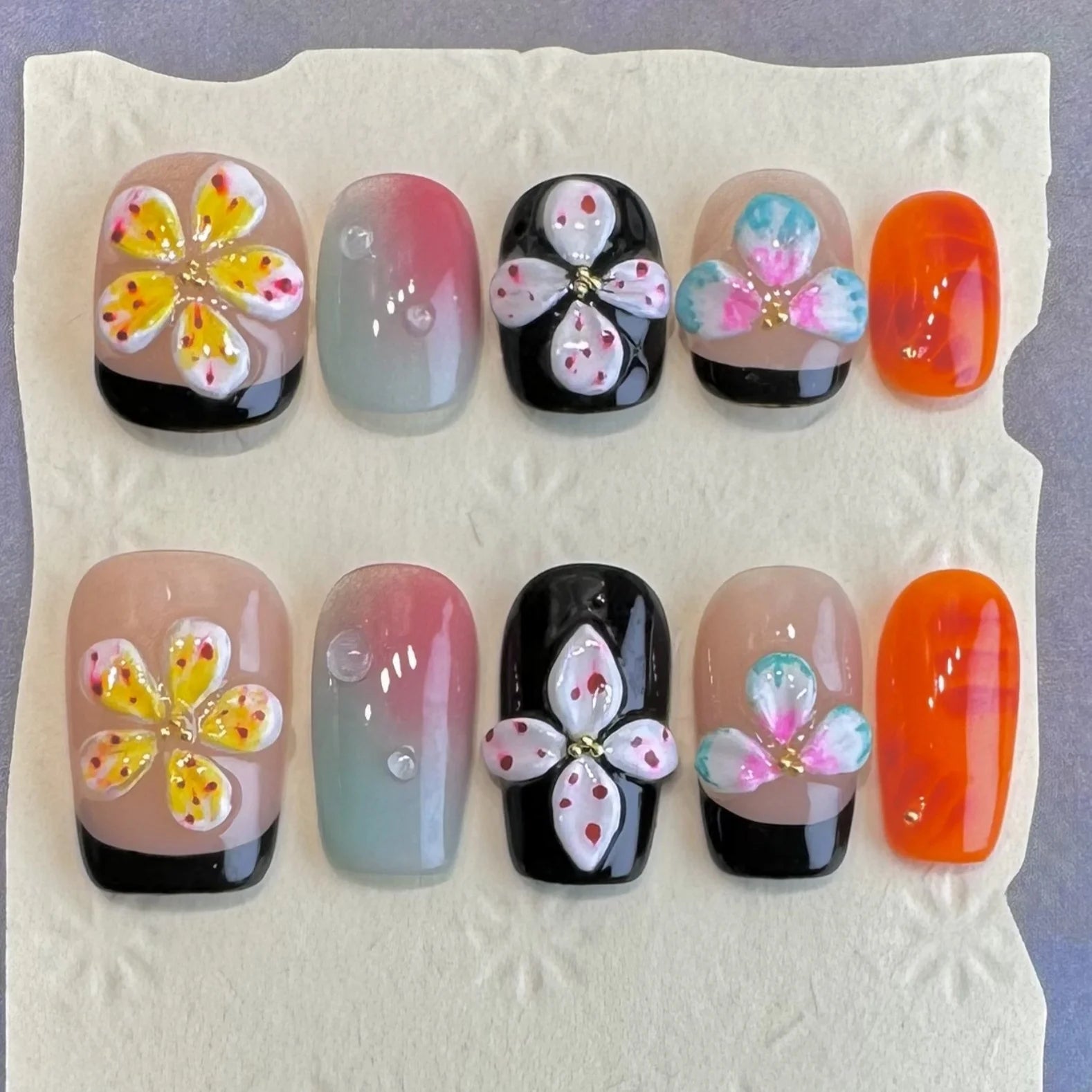 10pcs Black Pink French Style With Hand Painted 3D Flower Designs