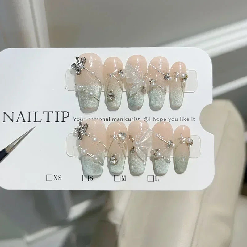 10pcs Gradient Pink Fake Nail With 3D Moon Heart Diamond Design m