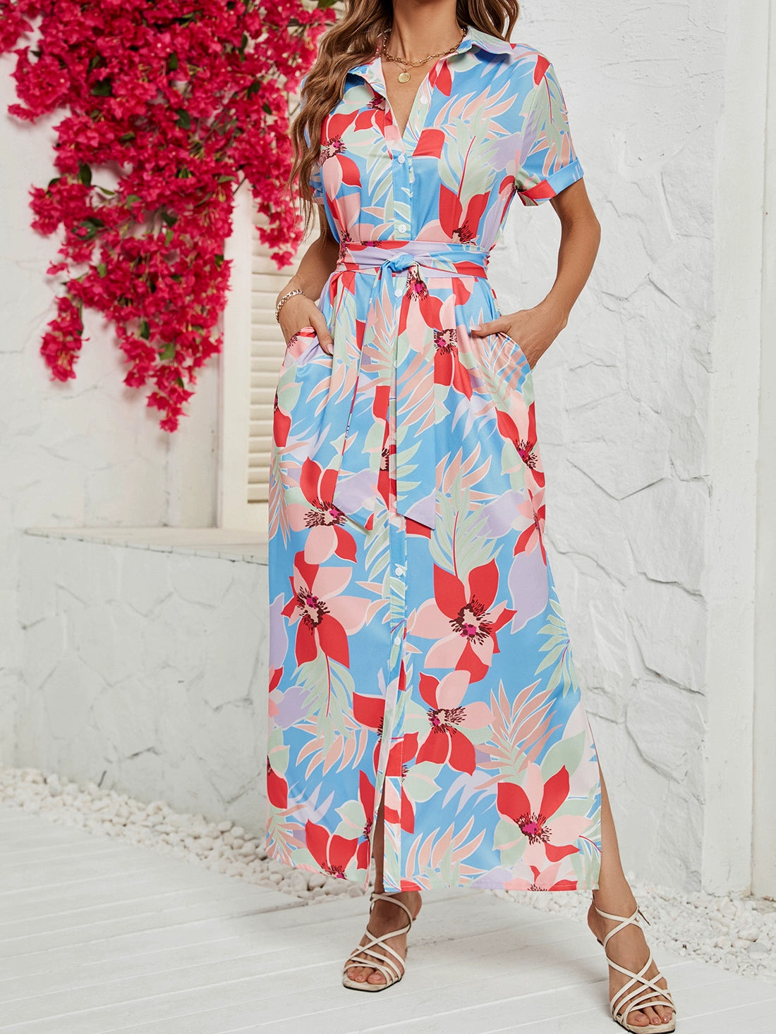 Lapel Short Sleeve Lace up Split Dress Lapel Short Sleeve Self-Tie Slit Dress