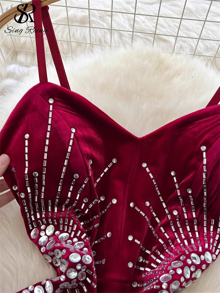 SINGRAIN Senior Evening Party Dress Spaghetti Strap Strapless Diamonds Design Women Elegant Fashion Bodycon Velvet Long Dress