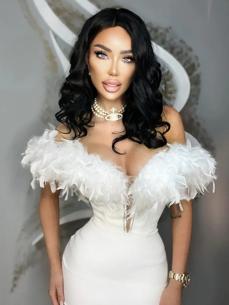 Summer Fashion Women Sexy Off Shoulder Feather Black White Pink Midi Bodycon Bandage Dress Elegant Evening Club Party Dress